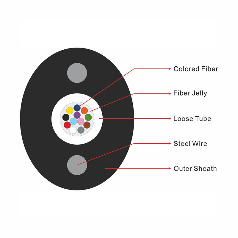 Các sợi, 250μm, được định vị trong một ống lỏng lẻo được làm bằng nhựa mô đun cao.Các ống này được làm đầy bằng một hợp chất làm đầy chịu nước.Người ta đặt hai sợi dây thép song song ở hai cạnh của cuộn băng thép.Cáp được hoàn thiện với vỏ bọc bằng polyetylen (PE).